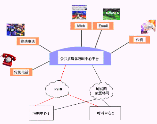 本呼叫中心平臺,可通過多種信令方式和PSTN網(wǎng)進行接入,包括CHINA-ISDN(30B+D)、中國一號信令、七號信令、SMS等,電話/傳真/手機/EMAIL/WEB形式的呼叫通過排隊交換機的話路自動分配(ACD)技術及CTI