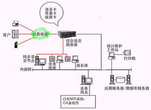本系統(tǒng)物理結(jié)構(gòu)由帶語音板卡的高性能工控機(jī)(稱為綜合語音服務(wù)器,在功能上可以分為CTI服務(wù)器、IVR(交互式語音應(yīng)答)/IFR服務(wù)器、統(tǒng)計(jì)維護(hù)管理工作站、數(shù)據(jù)庫(kù)/應(yīng)用服務(wù)器、錄音留言工作站、業(yè)務(wù)網(wǎng)關(guān)服務(wù)器、業(yè)務(wù)代表座席、網(wǎng)絡(luò)系統(tǒng)等和應(yīng)用軟件構(gòu)成。