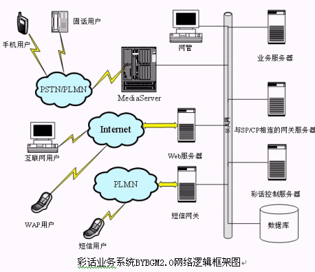為了描述彩話業(yè)務(wù)系統(tǒng)BYBGM2.0的呼叫流程,將彩話業(yè)務(wù)系統(tǒng)BYBGM2.0網(wǎng)絡(luò)邏輯框架圖經(jīng)過簡(jiǎn)化成為下列網(wǎng)絡(luò)拓?fù)浣Y(jié)構(gòu)圖: