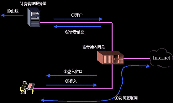 當(dāng)用戶選擇上網(wǎng)后。管理人員首先通過計(jì)費(fèi)管理服務(wù)器為用戶開戶。出用戶在打開瀏覽器試圖訪問Internet時(shí)會彈來自接入網(wǎng)關(guān)要求登入的窗口。用戶輸入用戶名、密碼并可以選擇適合自己的資費(fèi)方式。輸入信息后接入網(wǎng)關(guān)將信息交由計(jì)費(fèi)管理服務(wù)器處理。計(jì)費(fèi)管理服務(wù)器驗(yàn)證通過后,向該用戶開放互聯(lián)網(wǎng)出口。在用戶訪問互聯(lián)網(wǎng)的同時(shí),接入網(wǎng)關(guān)計(jì)錄下該用戶訪問互聯(lián)網(wǎng)的相關(guān)信息,其中包括訪問的時(shí)長和數(shù)據(jù)流量。接入網(wǎng)關(guān)實(shí)時(shí)地向計(jì)費(fèi)管理服務(wù)器更新用戶的計(jì)費(fèi)信息,用戶斷網(wǎng)后計(jì)費(fèi)管理服務(wù)器計(jì)算用戶上網(wǎng)費(fèi)用。