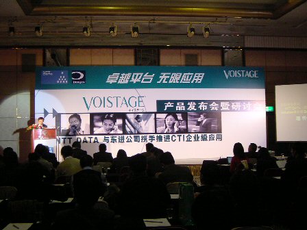 2004年2月19日,NTT DATA(中國)有限公司在北京長富宮飯店舉行了主題為"卓越平臺(tái),無限應(yīng)用"的VOISTAGE產(chǎn)品發(fā)布及應(yīng)用研討會(huì),在會(huì)上發(fā)布了CTI產(chǎn)品VOISTAGE。來自日本NTT DATA總公司的高層在會(huì)上發(fā)表主題演講時(shí)表示,NTT DATA將與戰(zhàn)略合作伙伴東進(jìn)公司攜手共同大力推進(jìn)VOISTAGE產(chǎn)品在中國中小企業(yè)級市場中的應(yīng)用。