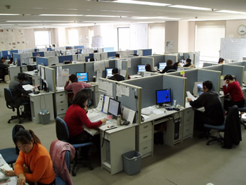 當(dāng)你站在這布局緊湊但井井有條、具有典型日式風(fēng)格的辦公大廳里,看到這些彬彬有禮的座席代表,耳邊又不時(shí)傳來各種聲調(diào)的日語時(shí),你會(huì)毫不懷疑地認(rèn)為自己是在東京或是橫濱的某個(gè)大公司的呼叫中心里。然而,從大廈的窗外望去,遠(yuǎn)處聳立的大連電視塔和眼前的勞動(dòng)公園都提醒你:這是在中國(guó)大連的商業(yè)區(qū)中心。