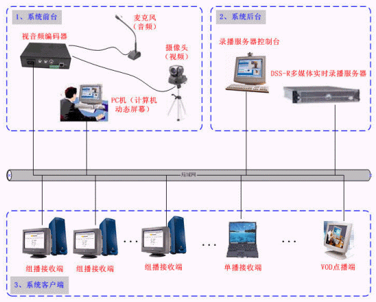 如上圖,DSS-R多媒體實時錄播系統(tǒng)主要由以下三部分組成: