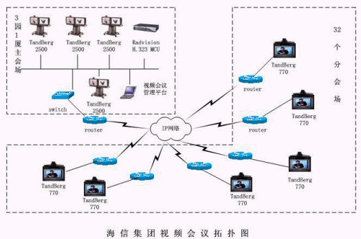 海信集團(tuán)有限公司會(huì)議電視項(xiàng)目的1.152兆共享線路,網(wǎng)絡(luò)設(shè)備采用了CISCO的路由、交換設(shè)備。在選型中,我們?yōu)橹鲿?huì)場(chǎng)配置了TANDBERG2500型號(hào)的產(chǎn)品,在分會(huì)場(chǎng)配置了TANDBERG880型號(hào)的產(chǎn)品。整個(gè)視頻網(wǎng)絡(luò)是分二級(jí)組建的,中心配置了RADVISION的MCU用來(lái)召開(kāi)36個(gè)點(diǎn)會(huì)議。視頻網(wǎng)絡(luò)結(jié)構(gòu)拓?fù)鋱D如下。