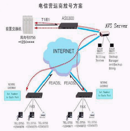電信運(yùn)營(yíng)商放號(hào)方案采用寬帶數(shù)據(jù)網(wǎng)絡(luò)接入到運(yùn)營(yíng)商,IP電話數(shù)據(jù)流通過(guò)寬帶數(shù)據(jù)網(wǎng)絡(luò)接入運(yùn)營(yíng)商的局端網(wǎng)關(guān)設(shè)備,或者直接進(jìn)入IP電話網(wǎng)絡(luò)。與傳統(tǒng)的電話相比,電信運(yùn)營(yíng)商放號(hào)方案不需要太多的額外投資購(gòu)買硬件設(shè)備;只需在用戶端安裝NETONE語(yǔ)音網(wǎng)關(guān)或IP電話機(jī),話吧、網(wǎng)吧、企業(yè)網(wǎng)用戶、校園網(wǎng)用戶及個(gè)人用戶就可以在現(xiàn)有的網(wǎng)絡(luò)基礎(chǔ)上實(shí)現(xiàn)IP電話放號(hào)服務(wù)。