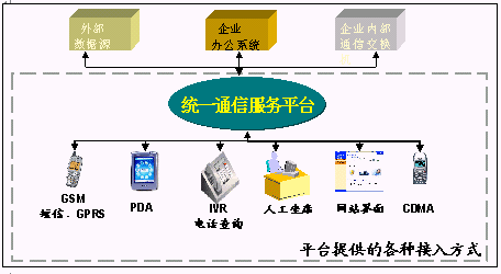企業(yè)統(tǒng)一通信平臺提供了多種接入方式:人工坐席接入、自動語音IVR、GPRS、WAP接入、寬帶接入、短信息接入;同時還提供了多種信息發(fā)布方式: