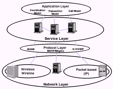 JAIN集成了有線(如PSTN)、無線(GSM、CDMA)和包交換(IP、ATM)網(wǎng)絡(luò),如上圖所示。