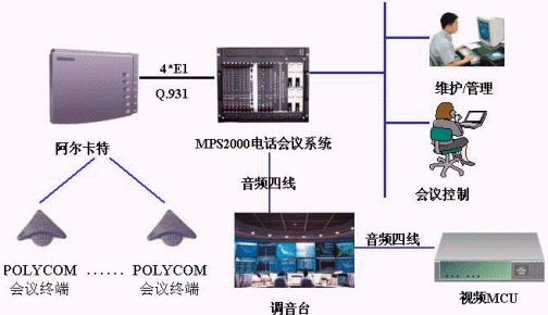 國電中心的音頻電話會議系統(tǒng)采用MPS2000電話會議系統(tǒng)。MPS2000電話會議系統(tǒng)通過4個E1與阿爾卡特的4400交換機相連,采用Pri信令,用戶通過POLYCOM的會議終端機參加會議;MPS2000電話會議系統(tǒng)通過音頻四線與調(diào)音臺相連,并通過調(diào)音臺與視頻MCU相連,同時MPS2000電話會議系統(tǒng)通過以太網(wǎng)與其內(nèi)部的局域網(wǎng)相連,同時在局域網(wǎng)內(nèi)設置一臺維護終端用于對系統(tǒng)的維護管理,會議控制臺通過WEB方式對會議進行控制。