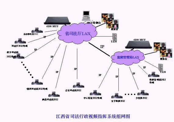 江西司法視頻會議系統(tǒng)的拓?fù)浣Y(jié)構(gòu)如圖所示。整個(gè)視頻會議系統(tǒng)為星型拓?fù)浣Y(jié)構(gòu),其中二級網(wǎng)以省司法廳和省監(jiān)獄管理局為主會場,放置2個(gè)MCU;另外,包括11個(gè)地市司法局的分會場(南昌、九江、贛州、吉安、撫州、鷹潭、萍鄉(xiāng)、新余、上饒、景德鎮(zhèn)、宜春),14個(gè)監(jiān)獄和農(nóng)場分會場,傳輸網(wǎng)絡(luò)為2M IP網(wǎng)絡(luò),視頻會議協(xié)議為H.323;司法局和監(jiān)獄管理局也可以單獨(dú)成網(wǎng),在分別依托省司法廳和省監(jiān)獄管理局MCU的情況下,各地市司法局或監(jiān)獄系統(tǒng)可與省司法廳或省監(jiān)獄管理局單獨(dú)進(jìn)行雙向的視頻會議,整個(gè)系統(tǒng)具有很強(qiáng)的靈活性和擴(kuò)展性。