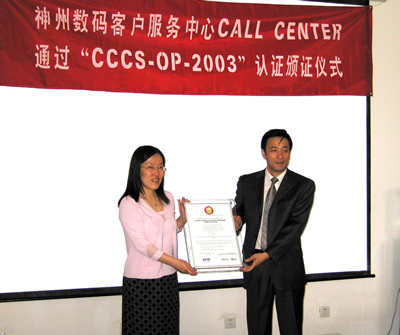 2005年6月2日,神州數(shù)碼呼叫中心通過了《全國呼叫中心運(yùn)營績效標(biāo)準(zhǔn)》(CCCS-OP-2003)認(rèn)證,并獲得由中國信息化推進(jìn)聯(lián)盟客戶關(guān)系管理專業(yè)委員會(huì)頒發(fā)的認(rèn)證證書(四星級(jí)客戶服務(wù)中心),成為國內(nèi)IT行業(yè)首家通過此認(rèn)證的呼叫中心。