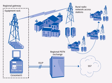 鄉(xiāng)村網(wǎng)絡(luò)方面,GroomerII通過EEMA協(xié)議與信道組合器相連,這樣即可與DaRT單元及廣播天線連接,進(jìn)而從本地網(wǎng)絡(luò)的存取點(diǎn)傳輸和接收信號。目前,本系統(tǒng)共裝備了16臺GroomerII網(wǎng)關(guān),每一個都與本地交換機(jī)相連。這些網(wǎng)關(guān)通過信道組合器和提供多達(dá)15個DaRT單元的E&M電路連接,支持30線的PSTN訪問。