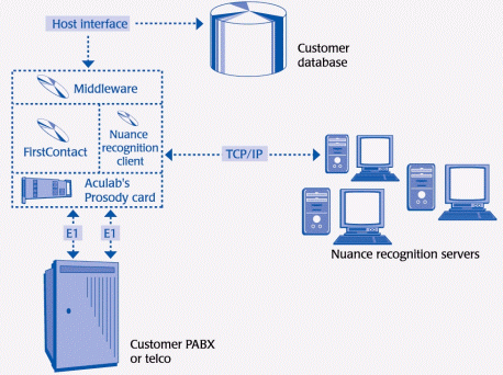 Prosody板卡位于系統(tǒng)的底層,已集成在VeCab系統(tǒng)中。FristContact 媒體服務(wù)器與Prosody硬件的通信是通過Aculab的統(tǒng)一API實現(xiàn)的。Prosody不僅用于TTS,而且也用于其它語音處理功能,例如放音、錄音、回音消除和DTMF檢測和生成。此外,VeCab 使用 Aculab的高密度數(shù)字網(wǎng)絡(luò)接口模塊來連接ACT的電話系統(tǒng)。