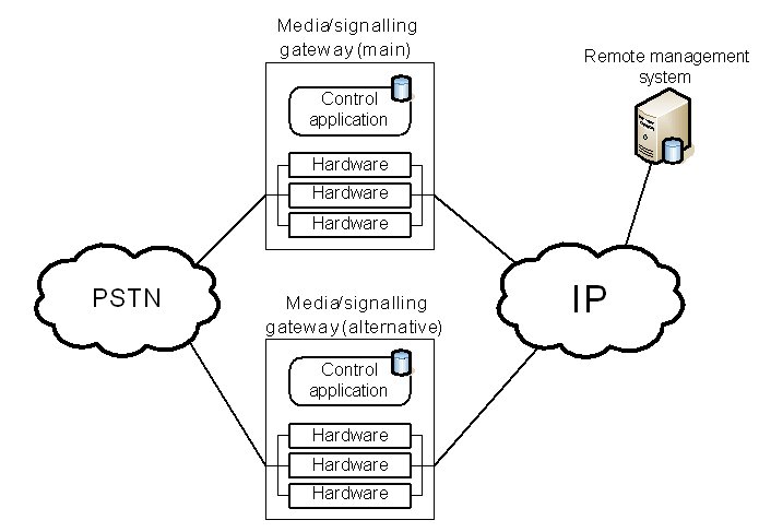 這兩種保護機制的區(qū)別可以從下面的例子進一步闡述。該事例是一種企業(yè)IP-PSTN網(wǎng)關(guān)應用。一般情況下,企業(yè)級的網(wǎng)關(guān)并不采用軟交換架構(gòu),所以媒體和信令網(wǎng)關(guān)功能在同一設備內(nèi)實現(xiàn)。這類網(wǎng)關(guān)是一個獨立的機架,內(nèi)裝能實現(xiàn)媒體和信令處理的硬件板卡和控制類應用程序。此設備可以本地管理,也可以采用遠程管理,如采用標準Web服務器。