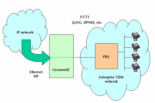 圖1中的GroomerII支持PRI協(xié)議,如:NI-2、ETS300和INS1500等,可以實現(xiàn)網(wǎng)關(guān)的功能把運營商自己的電路交換網(wǎng)和IP網(wǎng)絡(luò)相互連接在一起。這種設(shè)置允許網(wǎng)絡(luò)運營商向其他業(yè)務(wù)供應(yīng)商提供批量VoIP業(yè)務(wù)。這類業(yè)務(wù)運營商據(jù)此可以向他們的客戶提供具有區(qū)分性的業(yè)務(wù),如:利用SIP電話呼叫等。