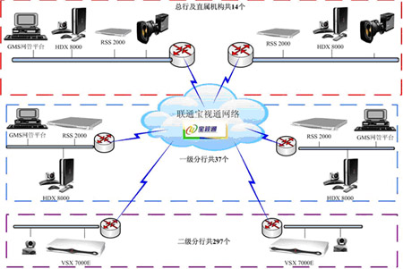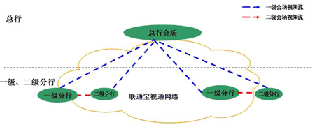 傳輸層:采用網通“寶視通”視頻會議運營網,該網架構在網通IP數據骨干網和本地傳輸與接入網之上的業(yè)務網,采用H.264協(xié)議,面向民生行提供可管理的商用視頻會議網。