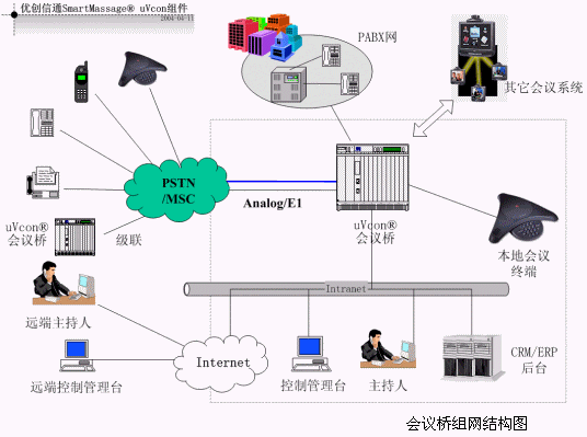 uVcon®會(huì)議橋是優(yōu)創(chuàng)科技(www.chinactn.com)的多媒體通信平臺(tái)SmartMessage®(見附錄)產(chǎn)品系列的音頻產(chǎn)品,功能包括建立會(huì)議、消息發(fā)布控制、會(huì)議數(shù)據(jù)記錄等功能。