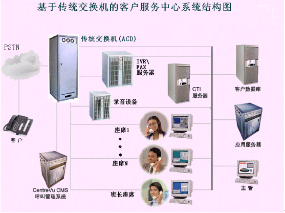 在以往大型CTI系統(tǒng)的設(shè)計(jì)中,這種模式是最常用的解決方案。傳統(tǒng)交換機(jī)由于其電信級(jí)標(biāo)準(zhǔn)的設(shè)計(jì),接入容量大、交換處理能力強(qiáng)、性能穩(wěn)定,因而往往被大、中型呼叫中心用在前端構(gòu)成ACD系統(tǒng)(自動(dòng)呼叫分配系統(tǒng))用來(lái)處理排隊(duì)、路由管理、坐席管理等功能。
