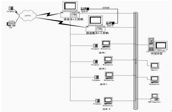 在一些小型CALL CENTER系統(tǒng)中,人們通常通過(guò)語(yǔ)音板卡加工控機(jī)的方式搭建系統(tǒng),通常一臺(tái)設(shè)備就集成了ACD、IVR、CTI等各種資源,各資源的使用、調(diào)派通過(guò)軟件進(jìn)行控制,有效的解決了建設(shè)成本高、系統(tǒng)構(gòu)造繁復(fù)的問(wèn)題,具有相當(dāng)?shù)撵`活性。然而由于工控機(jī)和語(yǔ)音板卡容量有限,同時(shí)其標(biāo)準(zhǔn)最多只能是工業(yè)級(jí)標(biāo)準(zhǔn),因此在構(gòu)建相對(duì)大型的呼叫中心時(shí)就總是捉襟見(jiàn)肘。為了增加系統(tǒng)容量,解決多臺(tái)PC之間進(jìn)行通道交換的難題,人們又設(shè)計(jì)了過(guò)機(jī)卡和過(guò)機(jī)線來(lái)解決,其應(yīng)用系統(tǒng)如下圖: