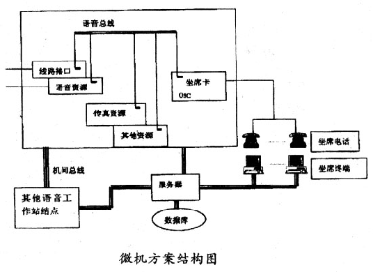 這種方案以近幾年發(fā)展迅速的微機(jī)語音處理技術(shù)為基礎(chǔ),其基本思想是在微機(jī)平臺上集成各種功能的語音處理卡,完成通信接口、語音處理、傳真處理、坐席轉(zhuǎn)接等功能,再結(jié)合外部的計算機(jī)網(wǎng)絡(luò)實(shí)現(xiàn)各種應(yīng)用系統(tǒng)的需求。