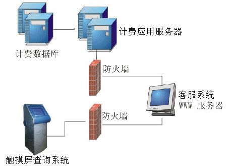 。。觸摸屏查詢系統(tǒng)通過WWW方式訪問鐵通客服系統(tǒng)的WEB服務(wù)器,再由WEB服務(wù)器訪問計(jì)費(fèi)系統(tǒng)的應(yīng)用服務(wù)器,由應(yīng)用服務(wù)器上的代理訪問計(jì)費(fèi)系統(tǒng)的數(shù)據(jù)庫(kù)。由于觸摸屏查詢系統(tǒng)與客服系統(tǒng)WEB服務(wù)器之間、客服系統(tǒng)WEB服務(wù)器與計(jì)費(fèi)應(yīng)用服務(wù)器每層都有網(wǎng)絡(luò)防火墻進(jìn)行隔離,同時(shí)客服系統(tǒng)的WEB服務(wù)器并不直接訪問計(jì)費(fèi)數(shù)據(jù)庫(kù),因此可以保證計(jì)費(fèi)系統(tǒng)的數(shù)據(jù)安全。在觸摸屏上用戶除了訪問系統(tǒng)提供的功能以外,不能做任何操作,再次保證了系統(tǒng)的安全可靠。