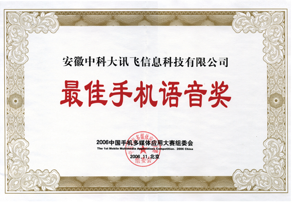 近日,首屆中國手機(jī)多媒體應(yīng)用大賽組委會(huì)將“2006最佳手機(jī)語音獎(jiǎng)”這份沉甸甸的獎(jiǎng)牌和證書授予了科大訊飛。這一由數(shù)十位業(yè)界專家和百萬手機(jī)用戶慎重評(píng)選出的獎(jiǎng)項(xiàng),充分說明了科大訊飛在手機(jī)語音應(yīng)用領(lǐng)域的領(lǐng)先地位,其分量不言而喻。