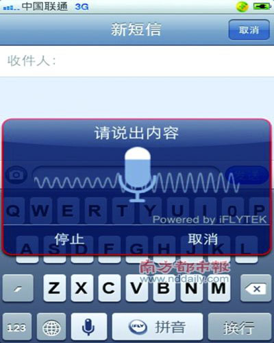 錄入結(jié)束后,點(diǎn)擊“停止”,輸入法會(huì)自動(dòng)開始對剛才錄入的語音進(jìn)行識別。需要注意的是,這個(gè)時(shí)候只有通暢的3G網(wǎng)絡(luò)或者W IFI網(wǎng)絡(luò),才能順利識別;如果信號欄顯示“E”或者“O”,都將無法得到正確識別,也無法錄入短信內(nèi)容。
