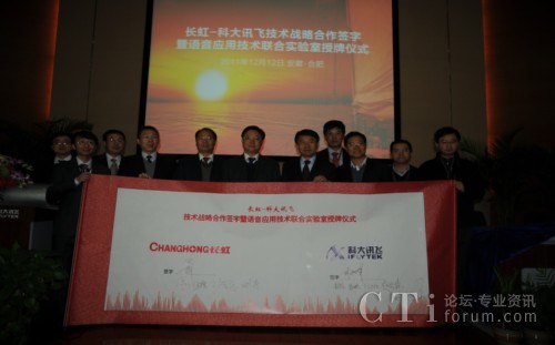 CTI論壇(ctiforum)12月14消息(記者 潘婷婷): 12月12日,科大訊飛與長虹集團(tuán)戰(zhàn)略合作簽約暨共建聯(lián)合實驗室揭牌儀式在科大訊飛語音產(chǎn)業(yè)基地研發(fā)大樓隆重舉行。根據(jù)合作框架協(xié)議,雙方將在戰(zhàn)略聯(lián)盟的基礎(chǔ)上,以共建聯(lián)合實驗室為主要載體,旨在依托各自行業(yè)領(lǐng)域的長期積淀優(yōu)勢、強(qiáng)強(qiáng)聯(lián)合,達(dá)成戰(zhàn)略互信,加強(qiáng)緊密合作,積極推動“語音核心引擎+智能終端平臺” 的特色應(yīng)用模式,深入拓展智能語音科技在智能電視等終端產(chǎn)品市場的應(yīng)用范圍,合力開創(chuàng)智能語音終端創(chuàng)新應(yīng)用市場空間。
