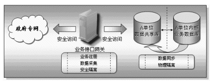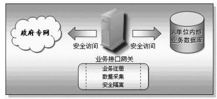 為了實(shí)現(xiàn)企業(yè)基礎(chǔ)信息交換與共享,各個(gè)接入平臺(tái)的單位必須將需要提供給其他單位的企業(yè)數(shù)據(jù)共享出來,基于安全、保密等多種因素考慮,這些單位的業(yè)務(wù)數(shù)據(jù)庫不可以也不應(yīng)該對(duì)其他單位完全開放(也就是直接連在政府專網(wǎng)上),而業(yè)務(wù)接口網(wǎng)關(guān)的作用就是將業(yè)務(wù)數(shù)據(jù)庫與政府專網(wǎng)之間的隔離、實(shí)現(xiàn)業(yè)務(wù)注冊(cè)以及數(shù)據(jù)采集等功能。業(yè)務(wù)接口網(wǎng)關(guān)的兩個(gè)網(wǎng)絡(luò)端口分別連接業(yè)務(wù)數(shù)據(jù)庫以及政府專網(wǎng),機(jī)關(guān)單位將它們業(yè)務(wù)數(shù)據(jù)庫中需要共享的業(yè)務(wù)數(shù)據(jù)項(xiàng)名稱注冊(cè)到信息中心的業(yè)務(wù)注冊(cè)庫中,其他機(jī)關(guān)單位通過查詢業(yè)務(wù)注冊(cè)庫獲取對(duì)方單位的業(yè)務(wù)注冊(cè)信息,并通過自己的業(yè)務(wù)接口網(wǎng)關(guān)向信息交換機(jī)發(fā)出業(yè)務(wù)數(shù)據(jù)采集的要求,信息交換機(jī)接收請(qǐng)求后對(duì)請(qǐng)求進(jìn)行校驗(yàn),校驗(yàn)通過后信息交換機(jī)會(huì)通過被采集業(yè)務(wù)數(shù)據(jù)庫所在單位的業(yè)務(wù)接口網(wǎng)關(guān)獲取業(yè)務(wù)數(shù)據(jù),數(shù)據(jù)通過信息交換機(jī)交換到采集單位的業(yè)務(wù)接口網(wǎng)關(guān),此時(shí)采集單位可以將數(shù)據(jù)保存在己方的采集數(shù)據(jù)庫中,或者直接由應(yīng)用系統(tǒng)使用。