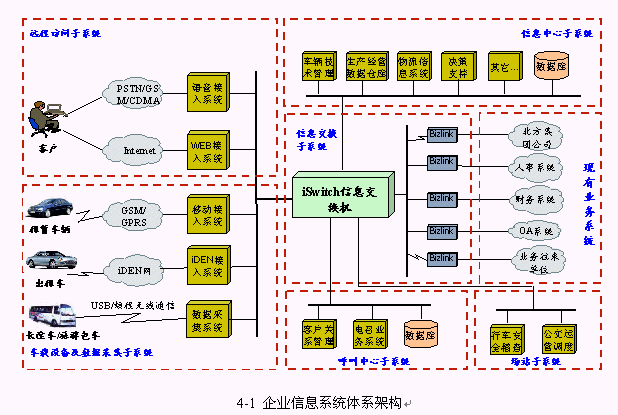 本項目中的企業(yè)信息系統(tǒng)由中心系統(tǒng)、場站系統(tǒng)、車載設(shè)備及數(shù)據(jù)采集系統(tǒng)和遠(yuǎn)程訪問系統(tǒng)組成,其中中心系統(tǒng)包括信息中心、呼叫中心、信息交換系統(tǒng)。項目實施過程中采用了黎明網(wǎng)絡(luò)自主知識產(chǎn)權(quán)的iSwitch信息交換機,系統(tǒng)邏輯結(jié)構(gòu)如下圖所示: