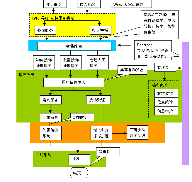 新一代的呼叫中心(即Call Center,是指以電話接入為主的呼叫響應(yīng)中心,它為用戶提供各種電話響應(yīng)服務(wù))運(yùn)用計算機(jī)網(wǎng)絡(luò)和通信網(wǎng),把呼叫中心的技術(shù)平臺與工商局現(xiàn)有的業(yè)務(wù)平臺及業(yè)務(wù)數(shù)據(jù)庫有機(jī)地結(jié)合起來,從而可以更好地發(fā)揮各方面的資源優(yōu)勢及改善工商局的總體服務(wù)水平。