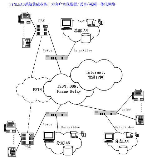 在這里,數(shù)據(jù)/話音/視頻一體化網(wǎng)絡(luò)主要是指多分支機(jī)構(gòu)集團(tuán)化企業(yè),通過(guò)ISDN、DDN、Frame Relay、Internet、寬帶IP等廣域網(wǎng)互聯(lián)手段,實(shí)現(xiàn)Data/Voice/Video"總線復(fù)用"的增值技術(shù)。