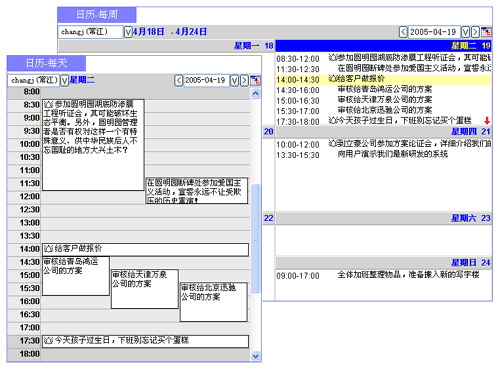 上圖"日歷管理"就借鑒了圖形化交互方法來安排日程和任務(wù)。這與您曾經(jīng)用過的桌面臺歷或記事本一樣,無需介紹就一目了然,并且要比在紙張上勾勾寫寫更方便、更有好處。例如,您此前計(jì)劃過日程,實(shí)際執(zhí)行有些變化,之后托托拽拽那個(gè)日程就可修改開始時(shí)間、持續(xù)時(shí)間,或修改主題內(nèi)容,有效提高了記錄工作日程的效率;又例如,可以根據(jù)需要設(shè)定"提醒"--即便對過期的、未及時(shí)處理的工作安排隨后也會提示,有了這樣的人性化服務(wù)助手,員工自然歡喜。