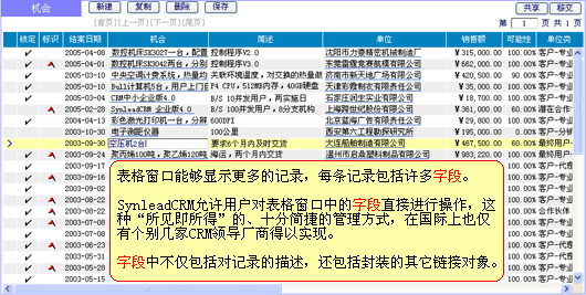 上圖"機(jī)會管理"表格窗口進(jìn)一步對人本化的管理方法進(jìn)行了舉例。在這里,您可直接對瀏覽到的字段進(jìn)行交互(是否能夠新建、修改、刪除,受管理授權(quán)或默認(rèn)授權(quán)約束),而不必一定要轉(zhuǎn)到另外的窗口才可操作字段。該方法在SynleadCRM中處處存在,它不僅僅為了提高工作效率,更讓企業(yè)在推行CRM管理變革時(shí)襯托出靈活性,而不是帶來了僵化。