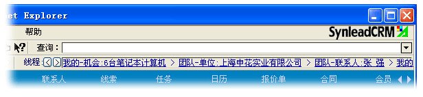 值得欣喜的是,部分CRM廠商意識到用戶迷路問題的嚴(yán)重性,并清楚IE瀏覽器具備的頁面歷史尋址(History Location)功能滿足不了頁面內(nèi)數(shù)據(jù)庫復(fù)雜、動態(tài)歷史條件的記憶,必須另外打造屬于CRM應(yīng)用程序自身的歷史堆棧。少許CRM軟件開始提供歷史“后退”、“前進”按鈕,SynleadCRM歷史精確度保持領(lǐng)先地位。