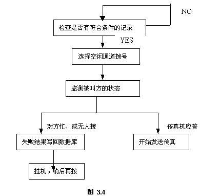 傳真發(fā)送功能是服務(wù)器后臺操作的,系統(tǒng)定時檢查傳真發(fā)送庫,一旦有符合條件的記錄,自動選擇空閑端口,按設(shè)定的傳真號碼撥號,檢查被叫方的狀態(tài),若對方有傳真機(jī)應(yīng)答,則開始發(fā)送傳真;若對方忙、或無人接,系統(tǒng)稍后會再次試撥。若超過設(shè)定次數(shù)仍未發(fā)送成功,系統(tǒng)會通知發(fā)送人作其它處理。
