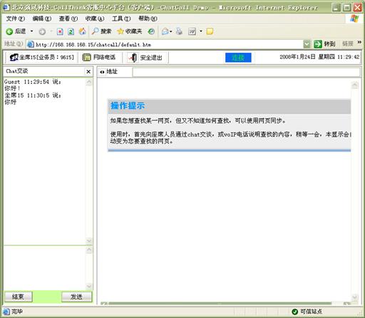 網(wǎng)頁(yè)同步:客戶(hù)在通過(guò)"客服代表回復(fù)"、"互聯(lián)網(wǎng)電話(huà)"、"文字交談"等方式與客服代表進(jìn)行實(shí)時(shí)交流時(shí),還可以通過(guò)網(wǎng)頁(yè)同步功能,與客戶(hù)代表的瀏覽器進(jìn)行同步。這樣,客戶(hù)與客戶(hù)代表看到的是同一網(wǎng)頁(yè),由客戶(hù)代表引導(dǎo)客戶(hù)對(duì)網(wǎng)頁(yè)進(jìn)行瀏覽,找到所需要的信息。網(wǎng)頁(yè)同步功能適用于不同的實(shí)時(shí)交流方式,可以大大提高客戶(hù)服務(wù)的效率和質(zhì)量。如圖14、15所示: