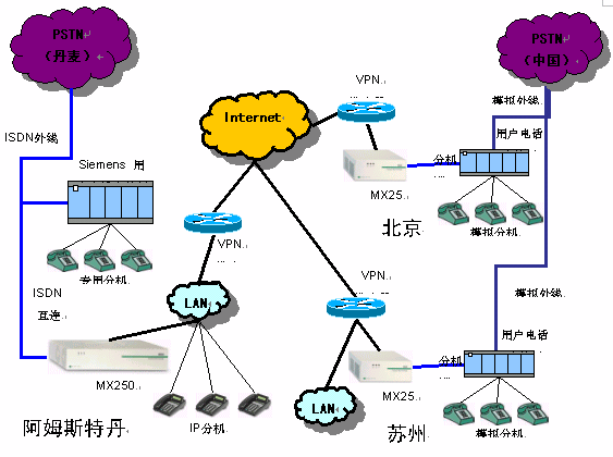 在阿姆斯特丹配置一臺MX250交換機,通過ISND連接原有交換機及丹麥PSTN網(wǎng)絡(luò),北京安裝一臺MX25網(wǎng)關(guān)與原有集團(tuán)電話互聯(lián),蘇州安裝一臺MX25與原有呼叫中心互聯(lián),三點通過基于Internet的VPN組成專用VOIP網(wǎng)。