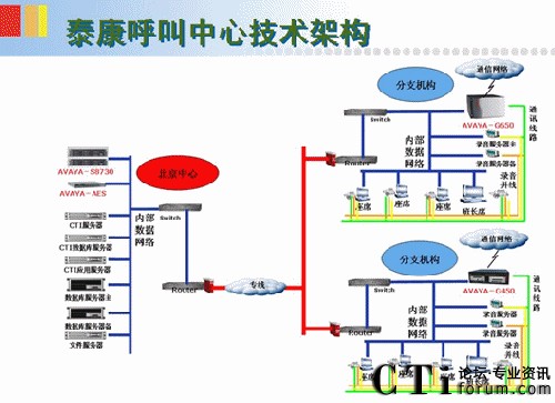 泰康電銷中心采用交換機+CTI+錄音+應用系統(tǒng)組成。在中心點普遍采用交換機模式。當中心點坐席規(guī)模大于60席位以數(shù)字中繼模式接入。當分點新建數(shù)量不足60座席時,采用遠端模式,相應采用交換機遠端模塊+CTI+錄音+應用系統(tǒng)組成。