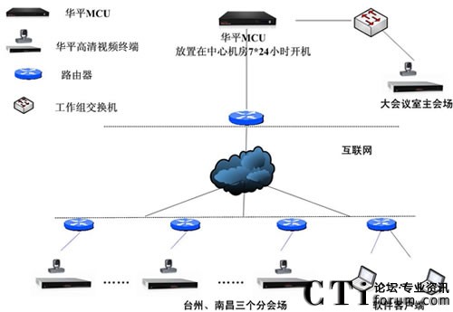 華平根據(jù)東森控股的實際需求,為用戶搭建了覆蓋上海、南昌、臺州辦公區(qū)、臺州營業(yè)部的高標清混合組網(wǎng)和軟硬件混合組網(wǎng)方案。系統(tǒng)基于公共互聯(lián)網(wǎng)實現(xiàn)部署,并充分利用了華平多種網(wǎng)絡接入混合的優(yōu)勢,并采取MCU雙網(wǎng)卡接入解決方案,全面實現(xiàn)了電信、網(wǎng)通的網(wǎng)絡良好互通,系統(tǒng)極大的拓展了應用的范圍,即使在差旅途中,只要能接入Internet網(wǎng)絡,用戶就可以輕松地參與會議交流,如同身與各方坐一個會議室。系統(tǒng)還提供強大的數(shù)據(jù)輔助功能,參會者可以將各種需要交流的數(shù)據(jù)、圖形、報表、文字等信息同步顯示給所有相關人員,方便的進行工作交流,業(yè)務匯報和討論等,使異地溝通變的更加簡單和自如。