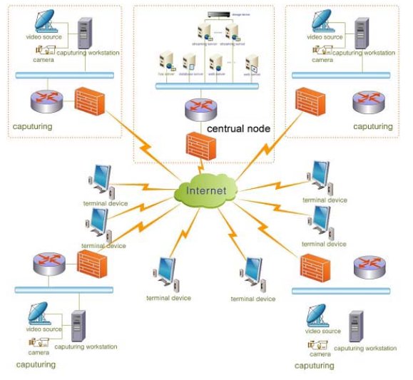 所有的部門的直播系統(tǒng)主要是進行部隊演習(xí)、會議等現(xiàn)場的直播,直播信號通過WebLIVE視頻直播采集系統(tǒng)編碼壓縮,通過局域網(wǎng)上傳到中心機房,實時發(fā)布。采集同時,將直播的數(shù)字信號存儲為AVI文件,上傳到放置在視頻點播服務(wù)器內(nèi),供其它地區(qū)的部隊指戰(zhàn)員進行點播。