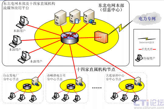 針對(duì)東北電網(wǎng)有限公司的需求,系統(tǒng)采用分布式網(wǎng)絡(luò)結(jié)構(gòu),并在14個(gè)直屬分支機(jī)構(gòu)部署CDN分節(jié)點(diǎn),中心機(jī)房架設(shè)一臺(tái)WEB服務(wù)器,1臺(tái)數(shù)據(jù)庫(kù)服務(wù)器,1臺(tái)流媒體服務(wù)器作為CDN中心服務(wù)器,1臺(tái)直播發(fā)布服務(wù)器、2臺(tái)直播采集工作站,14個(gè)分支機(jī)構(gòu)分別架設(shè)1臺(tái)流媒體服務(wù)器作為CDN邊緣服務(wù)器,具體配置如下: