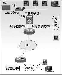 綜合業(yè)務(wù)數(shù)據(jù)網(wǎng)上的信息網(wǎng)VPN,連接省公司和各市公司的局域網(wǎng),桌面終端分布于省市兩級的局域網(wǎng)上。MCU通過三層交換方式接入省公司的信息網(wǎng),實(shí)現(xiàn)各個桌面會議終端的接入。在信息網(wǎng)上,要設(shè)置路由的QoS,實(shí)現(xiàn)桌面視音頻業(yè)務(wù)的優(yōu)先傳送。