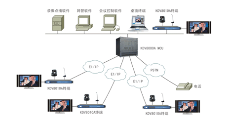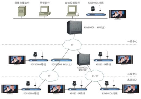 作為一款電信級MCU,KDV8000A具有強大的接入能力和豐富的功能模塊,可靈活應用于各類視頻會議系統。下圖1是KDV8000A在節(jié)點數量多、網絡環(huán)境復雜的大型視頻會議系統中的典型應用,下圖2是KDV8000A在衛(wèi)星視頻會議系統中的應用,下圖3是KDV8000A在多級級聯系統中的應用。