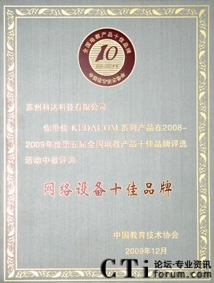 CTI論壇(ctiforum)12月14日消息(記者 張塵):2009年12月4日,由國(guó)內(nèi)教育權(quán)威機(jī)構(gòu)“中國(guó)教育技術(shù)協(xié)會(huì)”主辦,以讀者調(diào)查問(wèn)卷的形式舉行的第五屆全國(guó)電教產(chǎn)品十佳品牌頒獎(jiǎng)典禮在福州梅峰賓館盛大開(kāi)幕,科達(dá)教育視頻會(huì)議產(chǎn)品憑借卓越的產(chǎn)品性能和良好的客戶服務(wù)入選網(wǎng)絡(luò)產(chǎn)品類十佳之列,同時(shí)也成為首個(gè)入選十佳品牌的視頻會(huì)議產(chǎn)品。