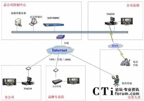 科達(dá)TrueSens視頻會議系統(tǒng)最大的特點就是擁有超強(qiáng)的網(wǎng)絡(luò)適應(yīng)性。由于采用了高效視音頻編碼技術(shù)和大量智能化網(wǎng)絡(luò)適應(yīng)技術(shù),無論是ADSL、光纖還是VPN,均可進(jìn)行快速接入,并充分保證在Internet環(huán)境下的會議效果。勁霸此次視頻會議系統(tǒng)就是基于Internet進(jìn)行部署的。如圖1。