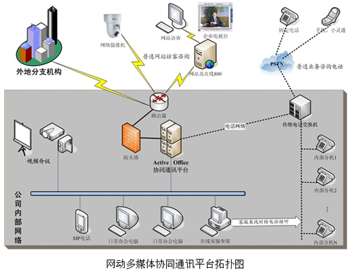 在上圖所示的Active Office客戶應(yīng)用圖中,網(wǎng)動協(xié)同通訊平臺承擔(dān)了統(tǒng)一通信中心樞紐的作用,將語音、視頻、數(shù)據(jù)完美結(jié)合,使IP網(wǎng)絡(luò)與電話網(wǎng)絡(luò)、本地網(wǎng)絡(luò)與遠(yuǎn)程網(wǎng)絡(luò)互聯(lián)互通,在同一個平臺上交互協(xié)同。