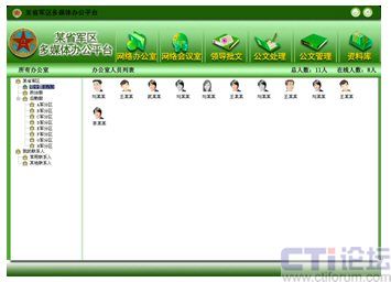 如圖所示的畫面即為網(wǎng)動協(xié)同辦公系統(tǒng)的基礎工具——協(xié)同通訊系統(tǒng),該系統(tǒng)可將部隊機構內(nèi)的所有部門、人員按照實際的組織結構列出,應用該系統(tǒng)的人員通過點擊其他在線人員,從而有選擇性的與對方進行語音、視頻、數(shù)據(jù)共享、點對點會議等各種操作,將以往“看不見”的對話變?yōu)椤懊鎸γ妗钡慕涣。相比于傳統(tǒng)的電話溝通而言,它不僅更暢通快捷,更可以最大化的降低溝通成本。另外,數(shù)據(jù)共享功能還可以將軍隊里需共同探討的話題,如作戰(zhàn)地圖動態(tài)研究、工作報告資料等實時顯示在數(shù)據(jù)區(qū)中,雙方通過電腦即可進行遠程的話題討論、圈點批注。