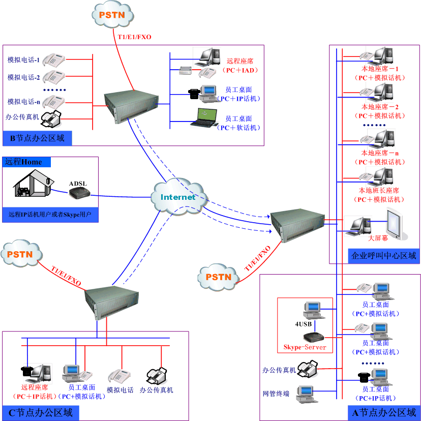 各區(qū)域內(nèi)部員工可以進(jìn)行0話費(fèi)的通話和傳真外,還可以非常輕松的實(shí)現(xiàn)長途旁路功能 (即長途費(fèi)用變市話費(fèi)用功能);同時(shí)每部分機(jī)同時(shí)具有一個(gè)真實(shí)的當(dāng)?shù)厥性捥?hào)碼和一個(gè)內(nèi)部分機(jī)號(hào)。