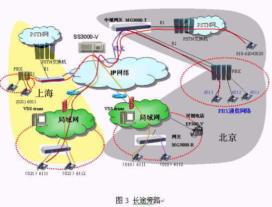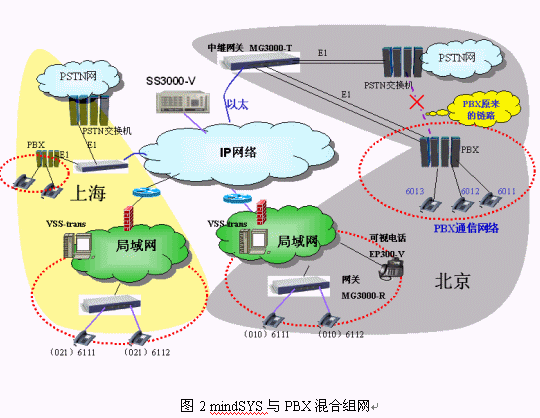 我們建設mindSYS系統(tǒng)的時候基本上不改變原來PBX的布線和配置,PBX原來的數(shù)字中繼直接連接到運營商的程控交換機,我們現(xiàn)在只是將PBX的數(shù)字中繼連接到中繼網(wǎng)關MG3000-T。PBX通信系統(tǒng)的電話完全沒有改變,還使用原來的電話號碼,打分機直接撥小號,打外線先撥0。mindSYS系統(tǒng)下的電話使用方式也完全一樣,對用戶來說就是一套系統(tǒng)。如北京的6011可以直接撥打6111,6111用戶也可以直接撥打6011,6111打外線先撥0,如062043020。北京的用戶呼叫異地用戶需要撥打完整號碼(大號),如北京的6011用戶撥0216111就可以接通上海的用戶,反之亦然。mindSYS系統(tǒng)的電話(圖2的所有電話)之間通話都免費。這樣我們的行業(yè)用戶可以既不改變原來的使用習慣,又能夠靈活的規(guī)劃各地的電話號碼來完成一個大型的跨地域的電話系統(tǒng)。