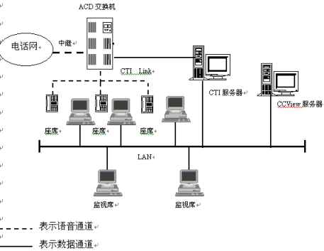 在呼叫中心系統(tǒng)中,ACD交換機(jī)除提供語音接入外,還提供高效的ACD(自動來話分配)功能,在本系統(tǒng),若需要監(jiān)視座席話機(jī)的狀態(tài),還必須提供計(jì)算機(jī)電話集成CTI功能。